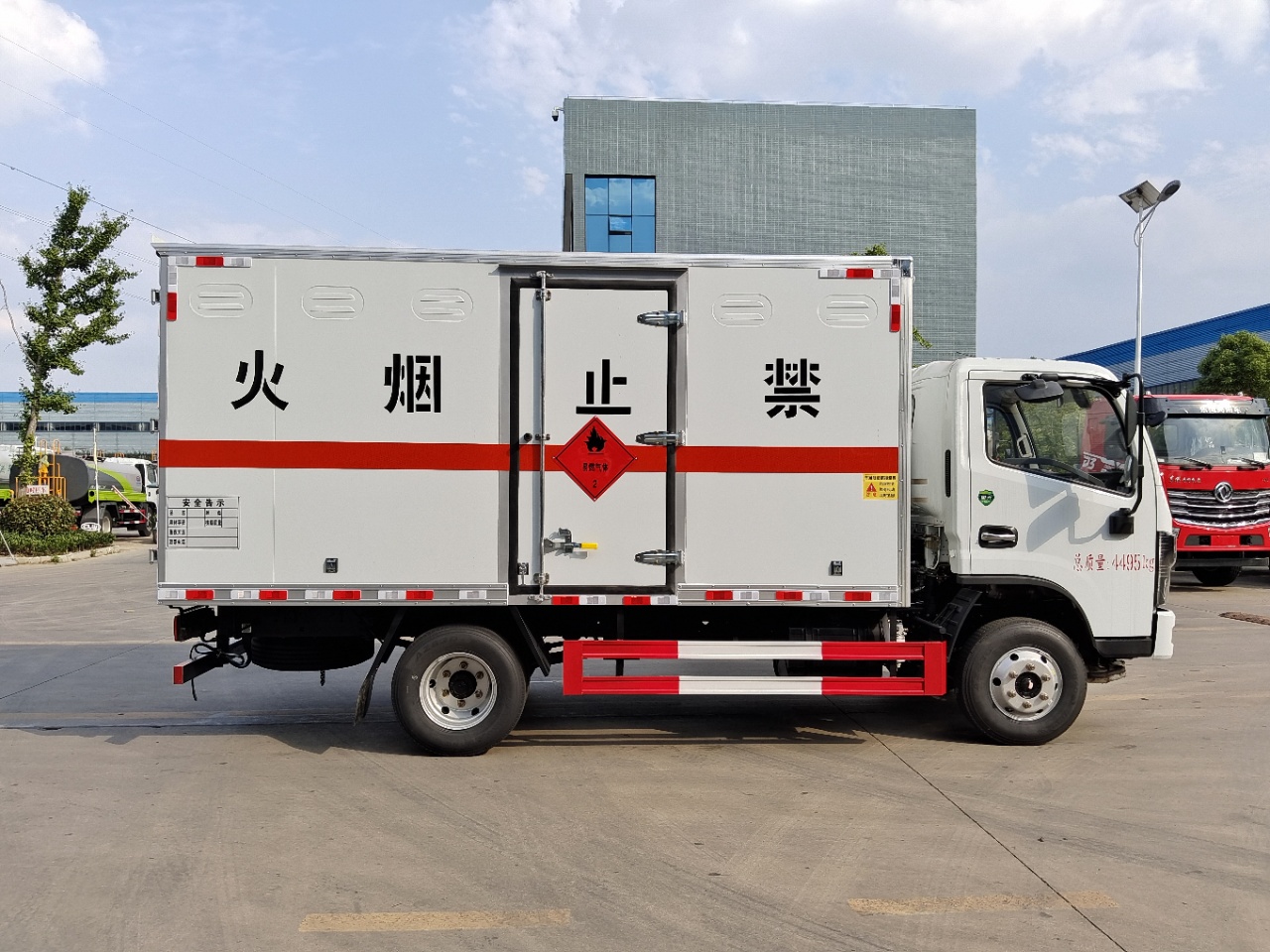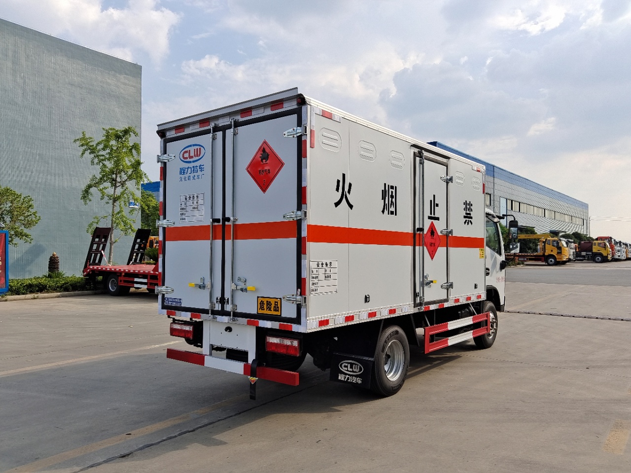 貨箱配置 廂體為雙層金屬骨架結構,外板采用冷軋鋼板,中間填充阻燃泡沫,內飾為鋁板。底板為平板上鋪防靜電膠皮。廂內兩側加裝固定貨物臥環,門框帶防盜報警器,頂部帶煙霧報警器,廂體右側選裝側門,隨車配2個滅火器,危險標志牌,防火帽,危險品三角頂燈。(也可用瓦楞板)