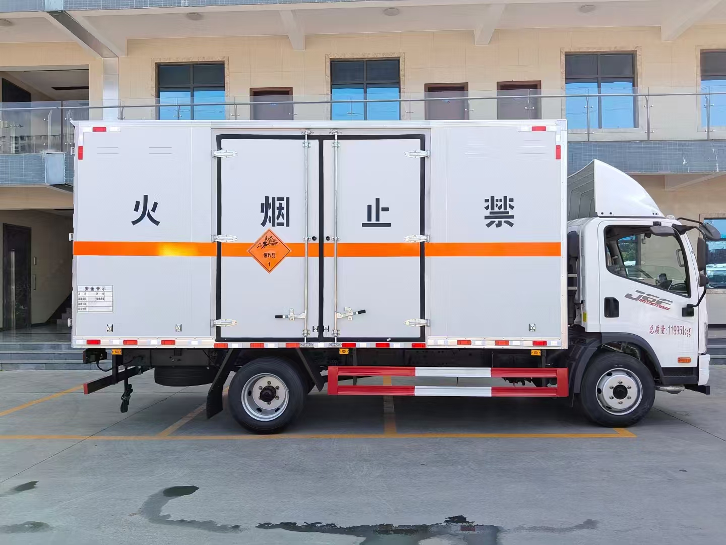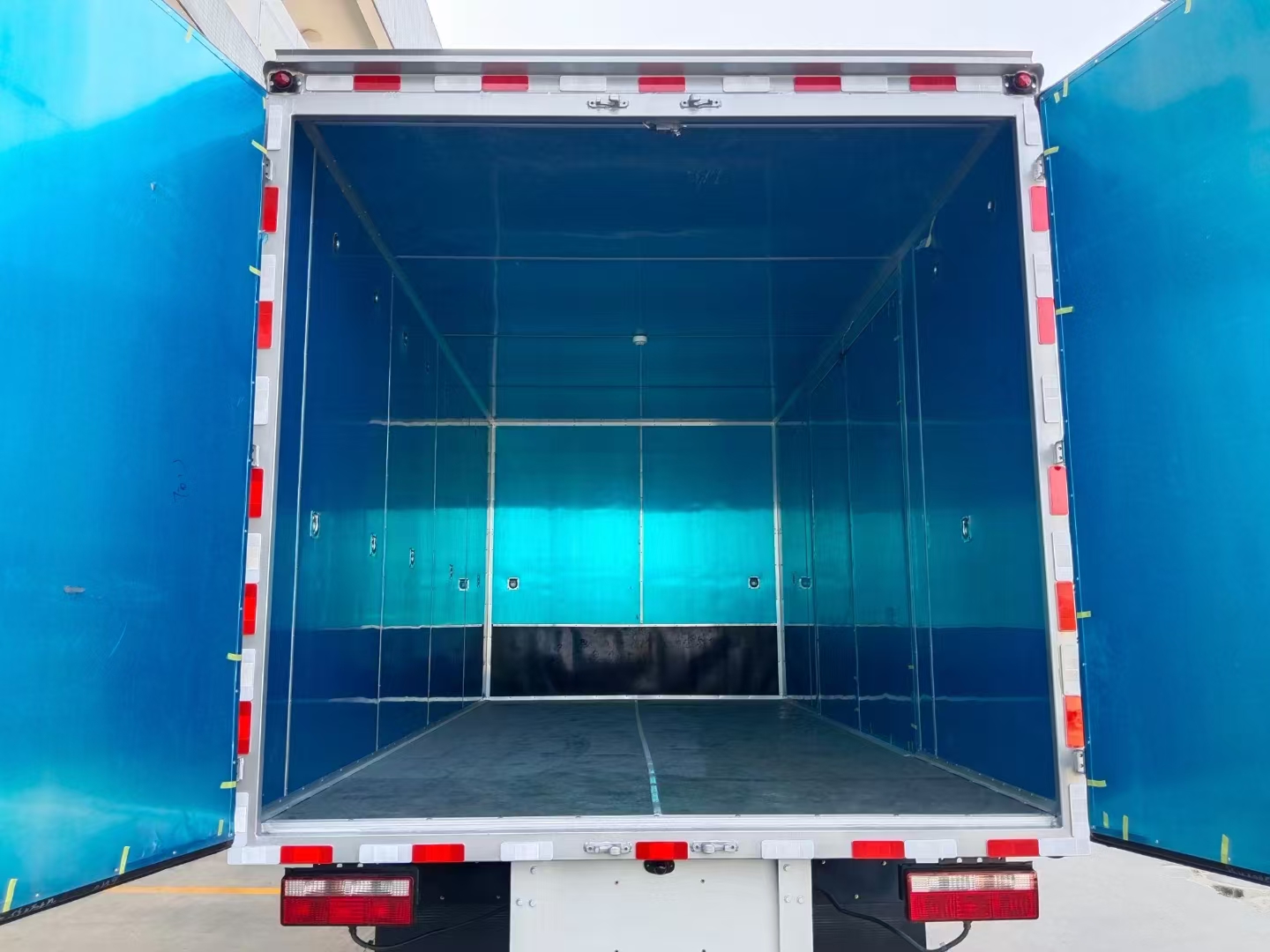 | 貨箱配置 | 廂體為雙層金屬骨架結構,外板采用冷軋鋼板,中間填充阻燃泡沫,內飾為鋁板。底板為平板上鋪防靜電膠皮。廂內兩側加裝固定貨物臥環,門框帶防盜報警器,頂部帶煙霧報警器,廂體右側選裝側門,隨車配2個滅火器,危險標志牌,防火帽,危險品三角頂燈。 (尾部可選裝液壓升降尾板) | ||