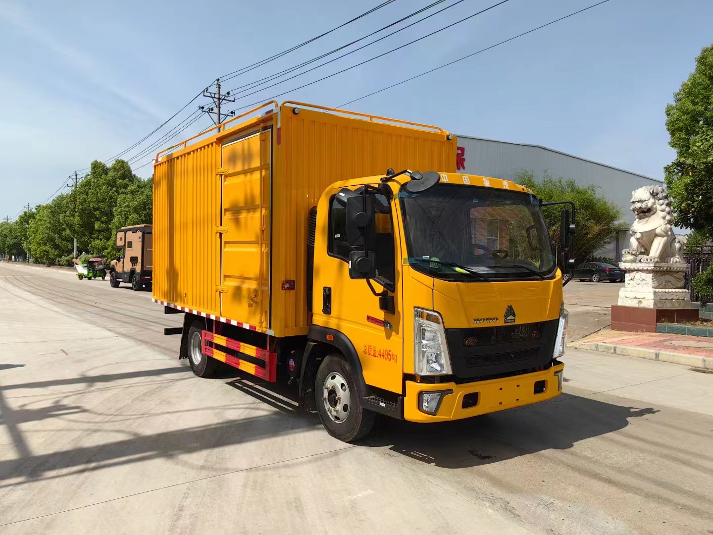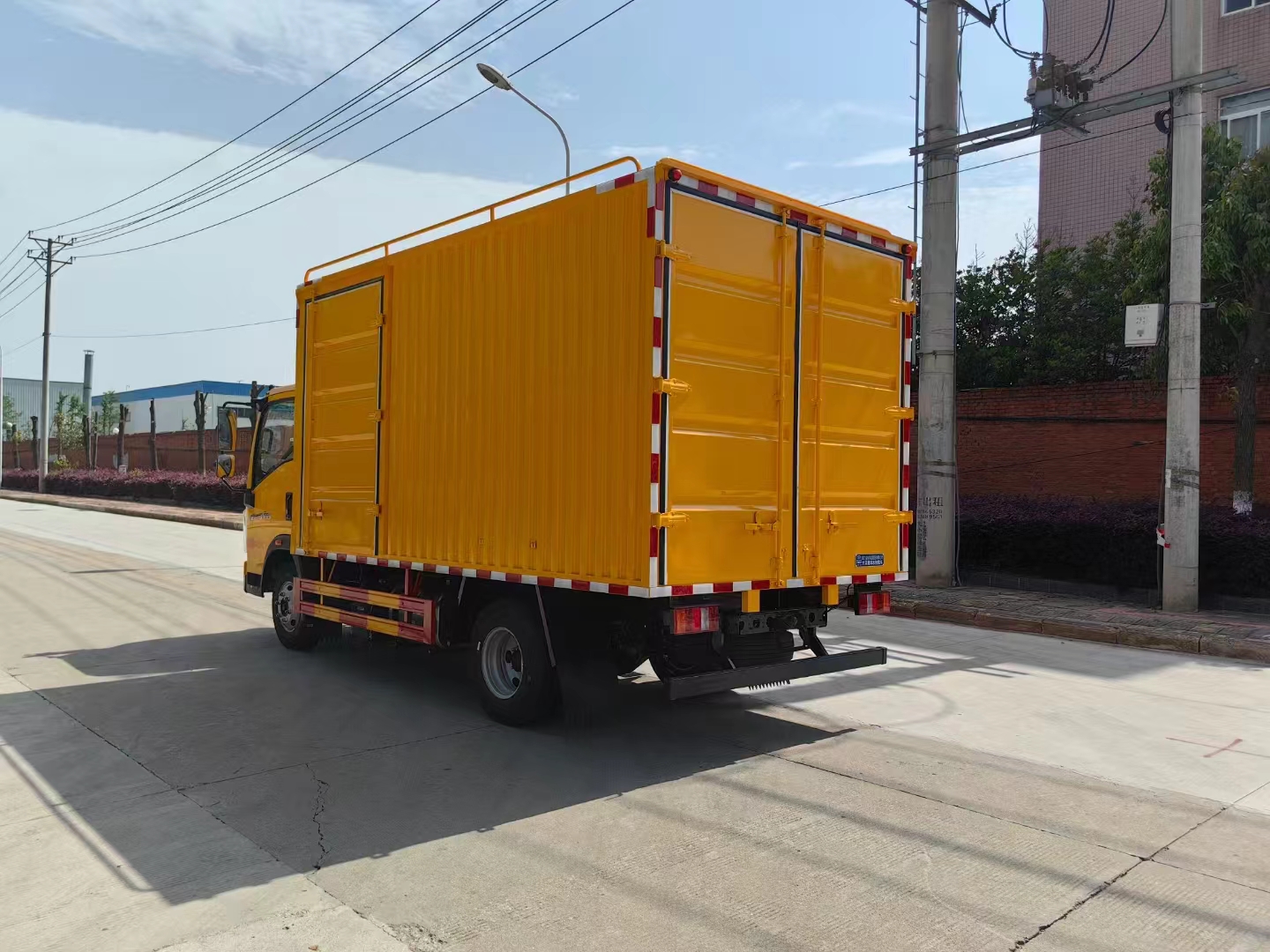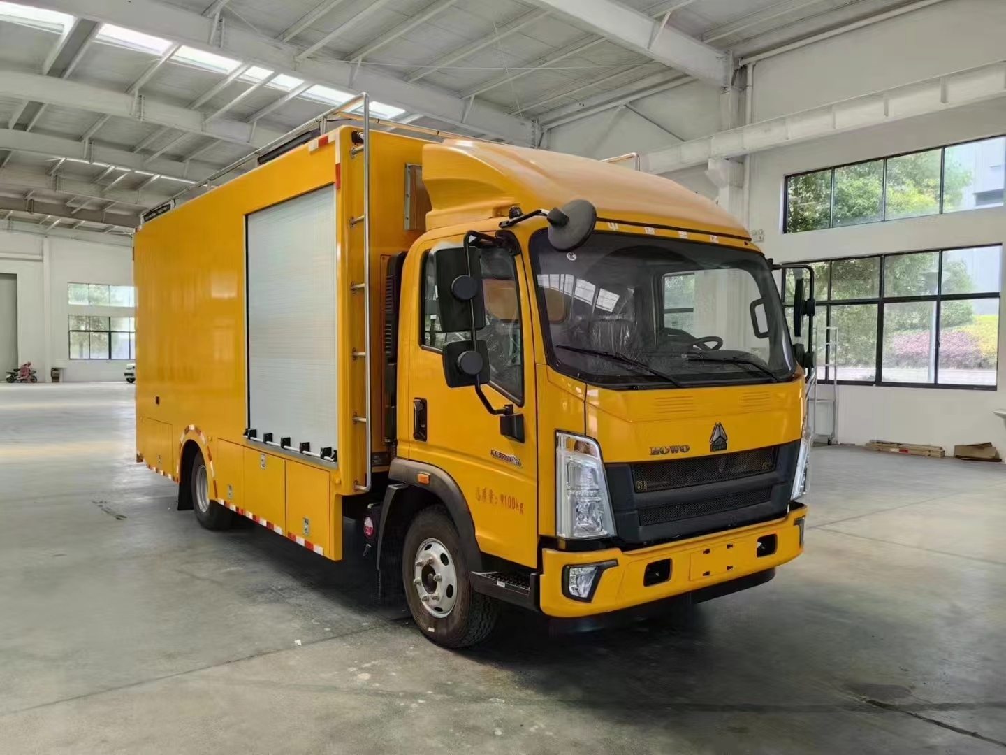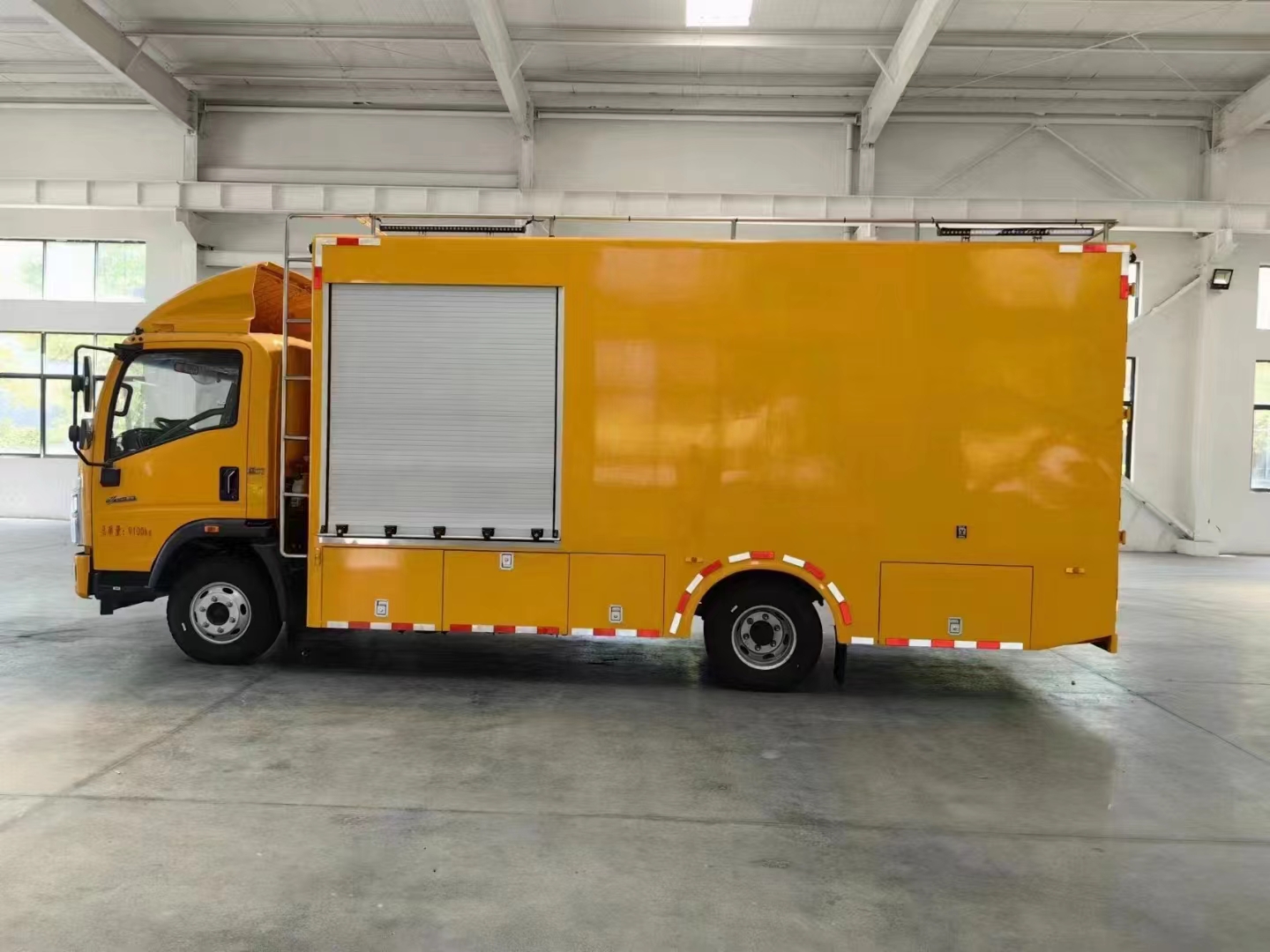 上裝配置  1、采用超大瓦楞板箱體或保溫隔熱箱體,箱體尺寸4200*2200*2000mm,右側箱體雙開門,后尾部箱體雙開門。按車廂大小貨架做上下兩至三層,帶攔板,防止物品掉落。車廂內頂部安裝2套LED照明燈,方便夜間操作,配150千瓦發電機組,或選配康明斯200千瓦斯坦福發電機組,6臺500方便攜式永磁排水泵,揚程10米,單臺泵排水量500m³/h,總排水量3000m³/h,揚程10m,重量32kg,單泵功率22KW,總功率132KW,出水口徑為200mm。