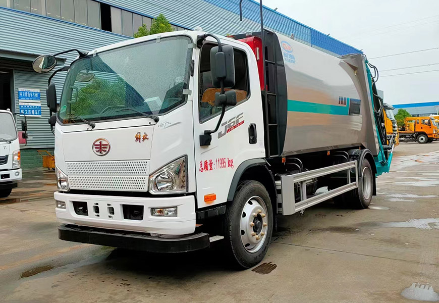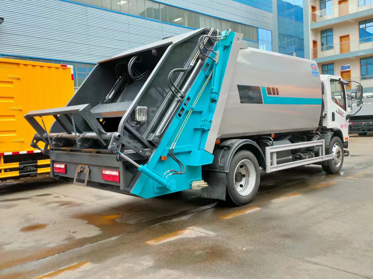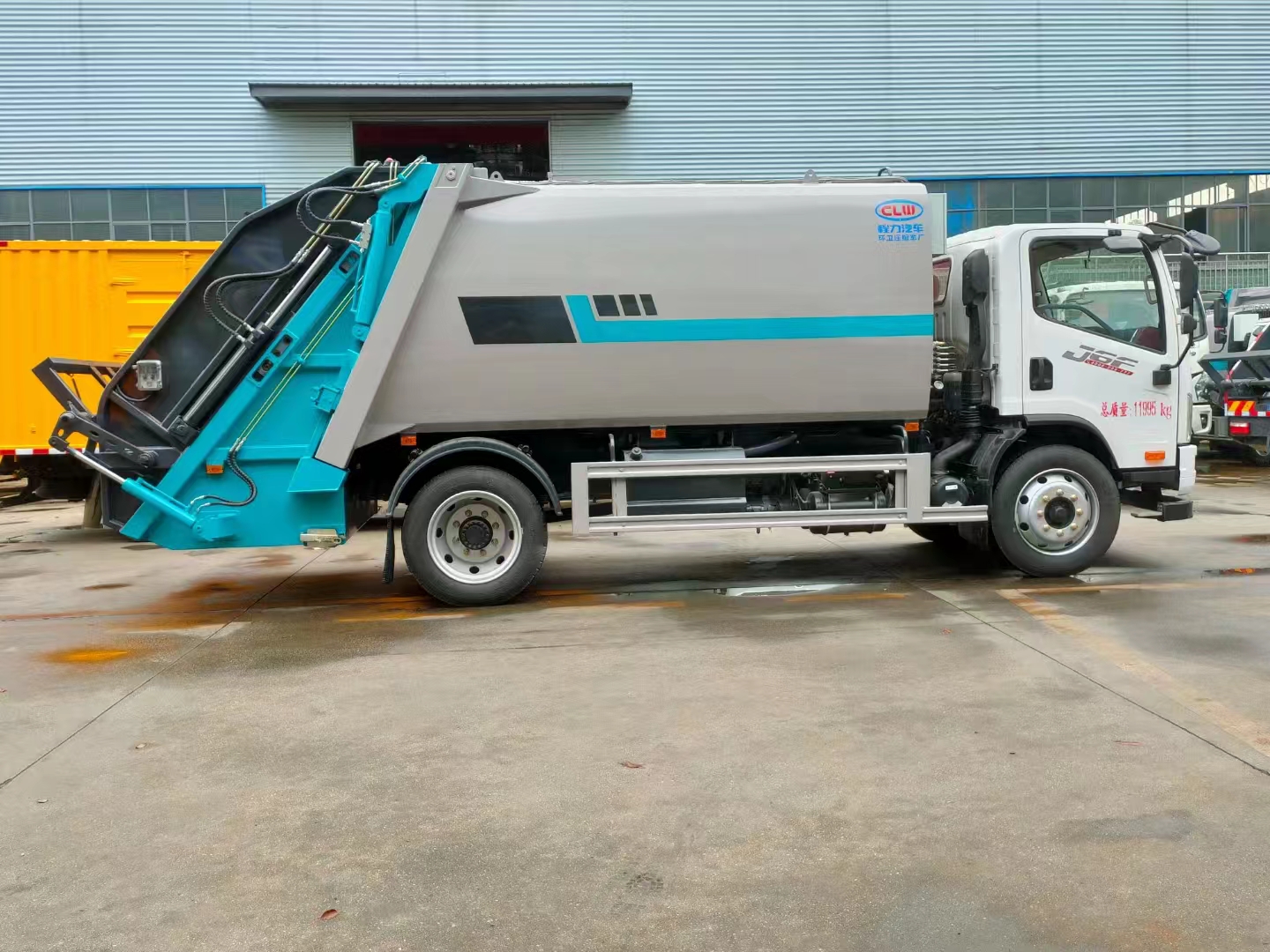 上裝配置 箱體容積11立方,采用邊四底四高強板制作,機器人自動焊,電泳工藝涂裝,威森博樂多路閥,皖液油泵,填裝器外置滑板油缸結構,尾部翻轉結構可掛120/240L垃圾桶。