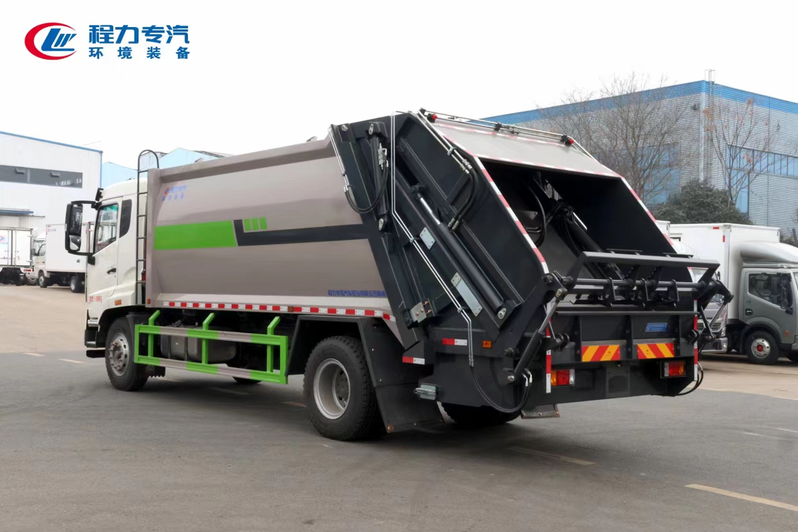 上裝配置 上裝為弧形箱體結構,采用Q345(局部采用T710)高強度板制作。有效容積15-18立方,采用中梅大通徑五聯手氣一體多路閥,全系標配背壓閥(增加雙向壓縮比),合資鐵殼液壓齒輪泵,嘉善取力器,中梅手氣一體多路閥,恒力油缸(質保兩年),加強型掛捅后翻轉機構(可選裝三角斗、全密封斗、擺臂等翻轉機構),外置滑板缸結構設計,石墨烯尼龍滑塊,長沙福力CAN總線控制系統,尾部帶有硅膠控制面板,標配無線遙控,帶光電感應保護裝置,標配后污水箱,(中聯樣式雙排污口),可加裝側邊污水箱。加裝氣動密封蓋。