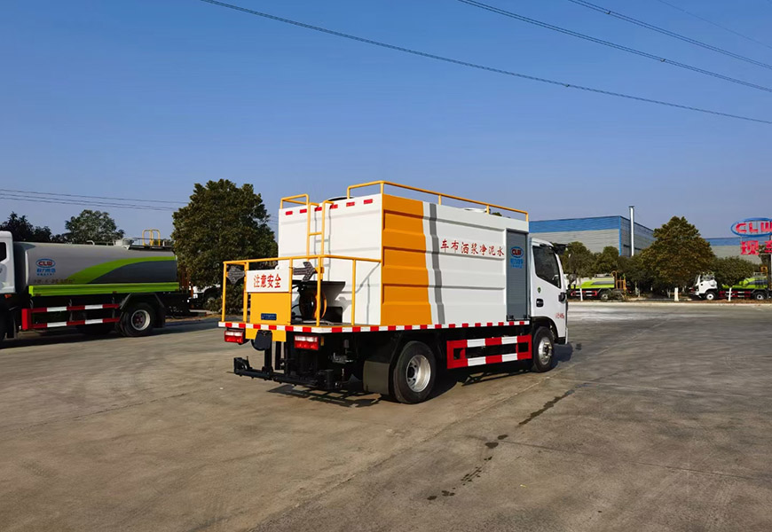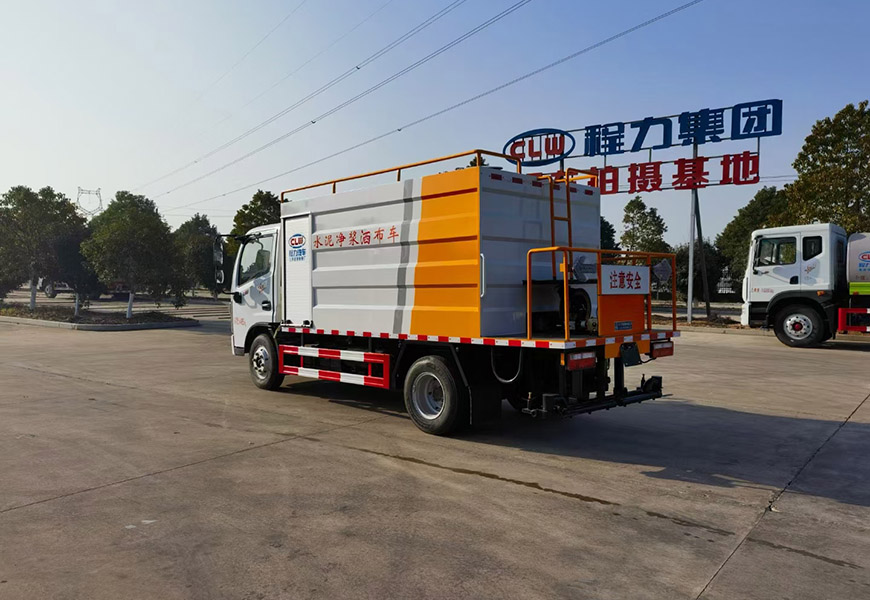 上裝配置 水泥罐、清水罐采用 Q235 優質碳鋼制作,高壓水泵水泥砂漿泵(專用),攪拌系統,液壓系統,15 米高壓清洗管道(帶卷盤、手持清洗槍),尾部13個水泥漿專用噴頭,最大酒布寬度4米。其它配置常規,可選裝袋裝水泥提升裝置(用于袋裝水泥向罐體頂部運輸)