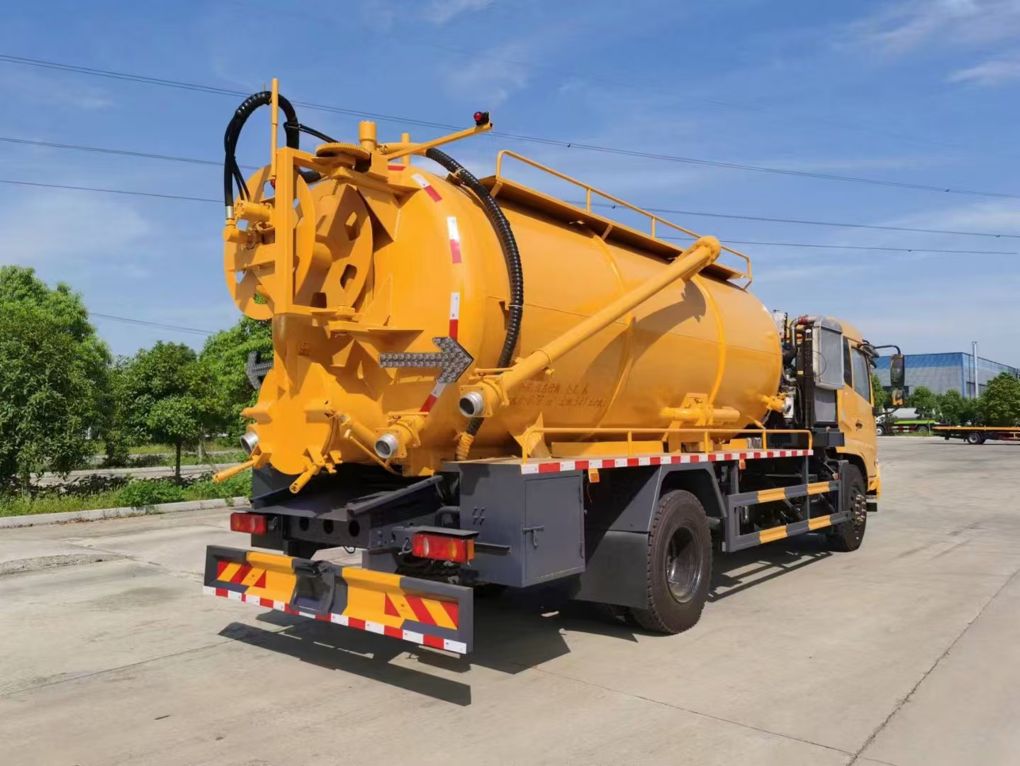 上裝配置 罐體容積15立方左右,清水罐5立方,其余為污水,罐體8mm厚,封頭8mm厚,舉升頂為自卸中置頂,副駕駛一側清水罐和污水罐用DN100球閥互通,另罐頂裝一個互通,副駕駛一側按照公告圖片安裝爬梯;清水罐:品孚350高壓泵,罐頂水車罐口一個,帶爬梯,高壓管100米22號高壓管,尾部液壓卷盤,左右各裝一個消防栓進水口,清水罐裝兩側各一個小球閥,罐底裝一個DN65排水閥, 吸污罐:一個散水罐口,罐體內部鋪1.2米不銹鋼板,罐內爬梯,罐體內部防浪板加固,水循環泵水箱為碳鋼材質.副發濰柴375馬力配SK-30水循環泵,副駕側排150鋁合金球閥,開600小蓋排污口,尾部600小蓋左側一個150排污口,右側一個100的進料口,側邊一個100排清水,罐體尾部兩側工具箱,1根10米吸污管,箭頭燈,手動油門…