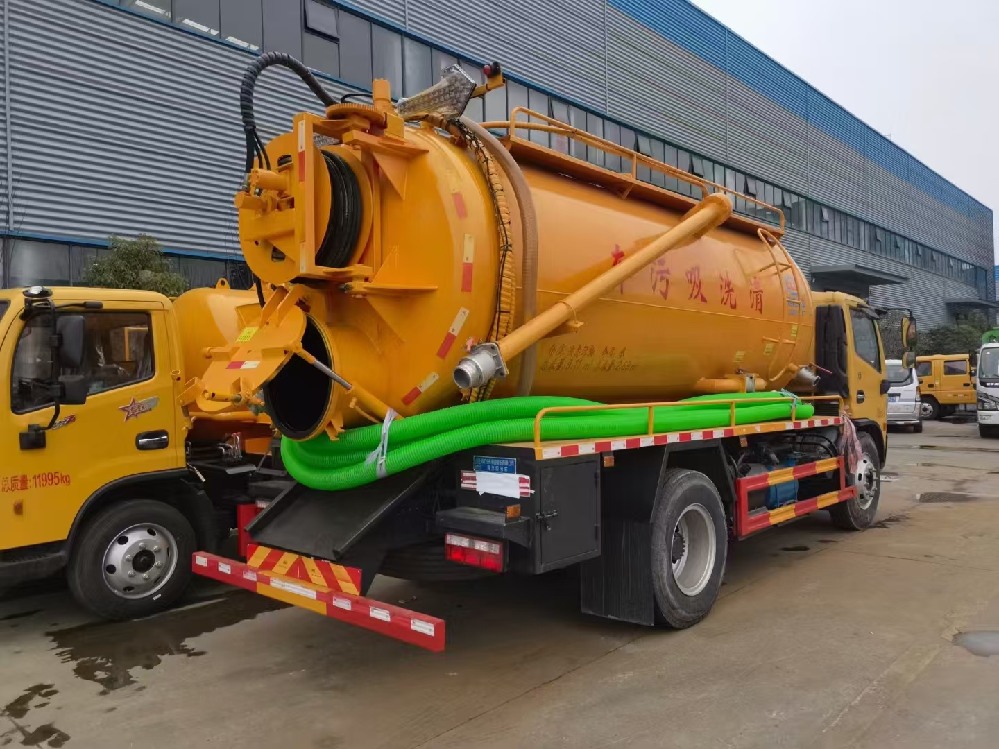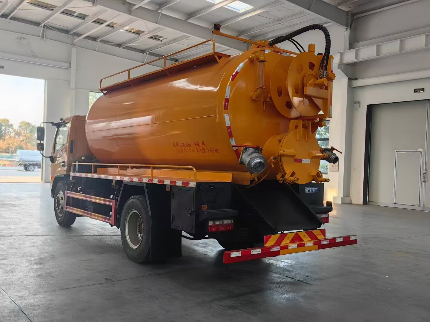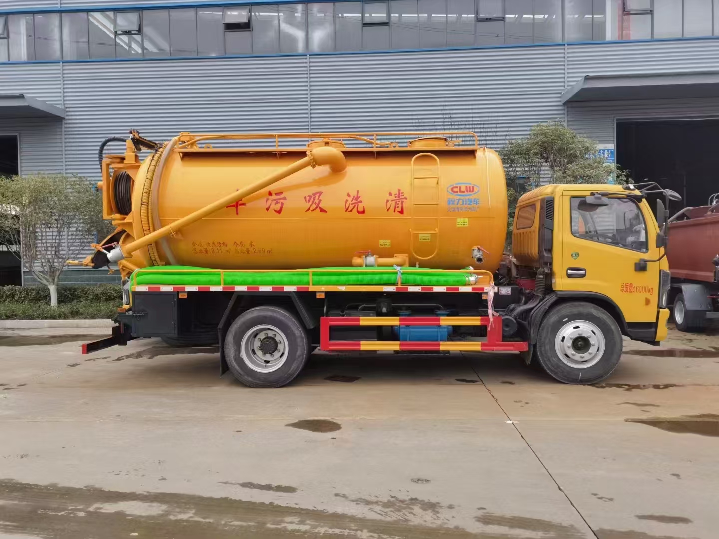 上裝配置 吸污罐容積約9立方,清水箱約4立方,污水罐6mm制作,清水罐和污水罐安裝互通。清水罐一個量水管,水箱最低點一個DN65球閥,帶消防接頭,品孚255流量高壓泵,帶60米19號高壓管,卷盤液壓旋轉180度,液壓收放管. 污水罐:SK-15水循環泵,水循環泵水箱為碳鋼材質,頂部防溢閥位置盡量最低,后蓋600液壓打開,100球閥直通罐頂吸污尾部一個150的排污球閥,吸污壓力表裝在水箱附近,罐體尾部兩側工具箱,手動油門,1根8米吸污管帶陰陽端接口,一個水雷槍頭,其他廠內標配…