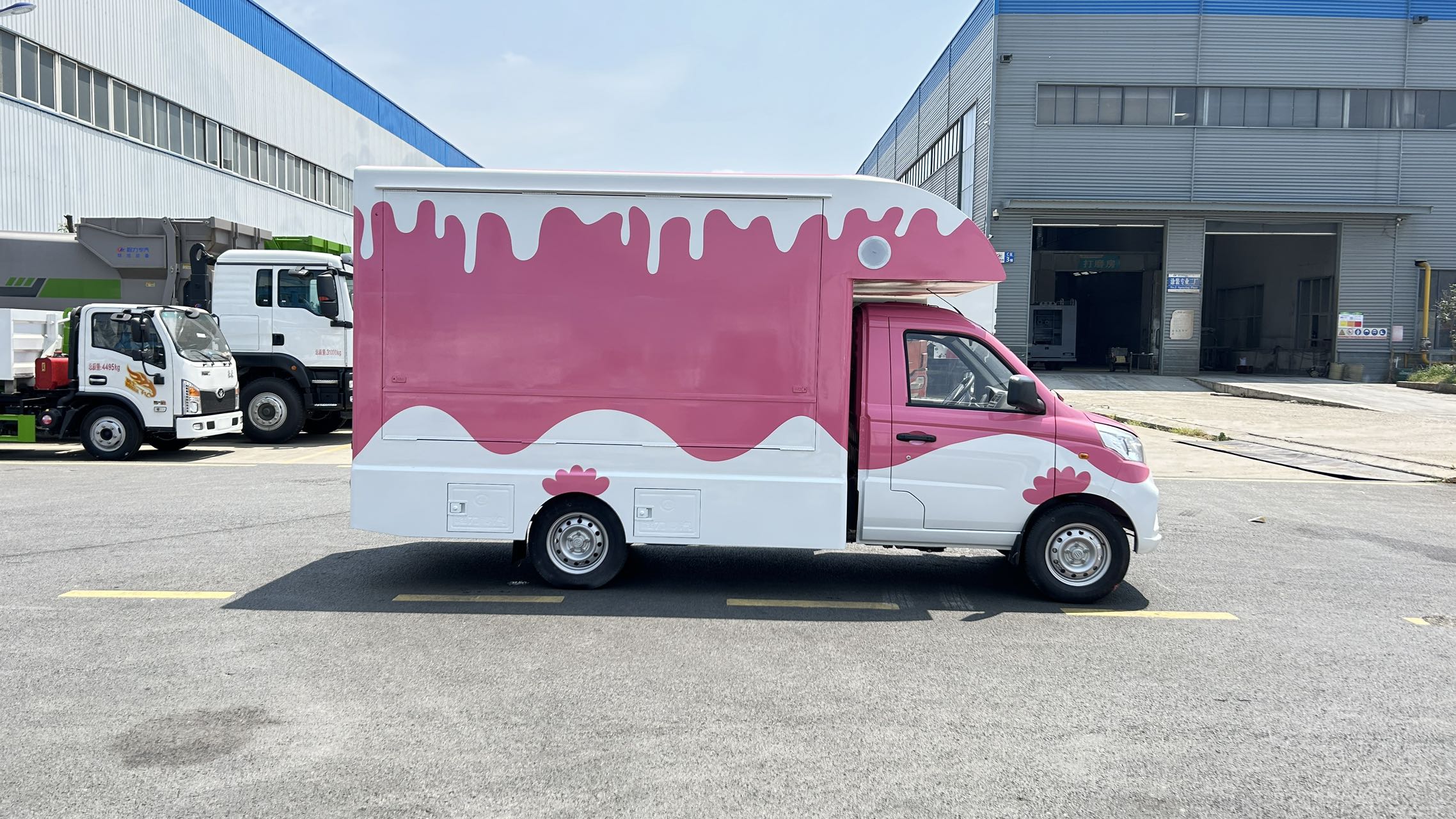 上裝配置 1,箱體材質:矩形方管骨架,冷板蒙皮結構,翻板采用內外彩鋼板,中間高性能保溫板,側板整體復合,輕量化,保溫隔熱。整體車身顏色為白色,可定制車身各種顏色彩條拉花,或各種噴涂樣式,(選裝內部不銹鋼飾面板) 2,箱體結構: (1)箱體鴨嘴額頭設計,帶儲物功能。 (2)箱體兩側上翻板,帶下翻吧臺。 (3)地板為防滑鋁花紋板,箱體裙邊包圍,帶檢修艙門,工具柜。